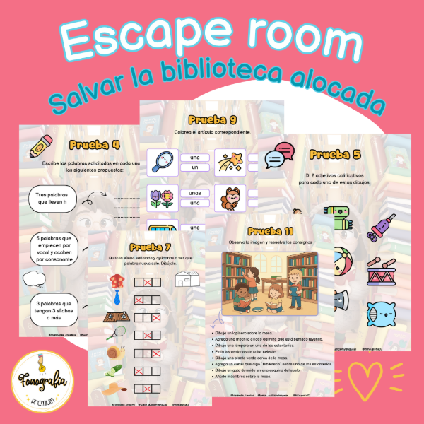 Un recurso pensado para educación infantil y primer ciclo de primaria, donde los niños deberán resolver 11 desafíos para salvar la biblioteca y rescatar las palabras de los libros. 📖💫