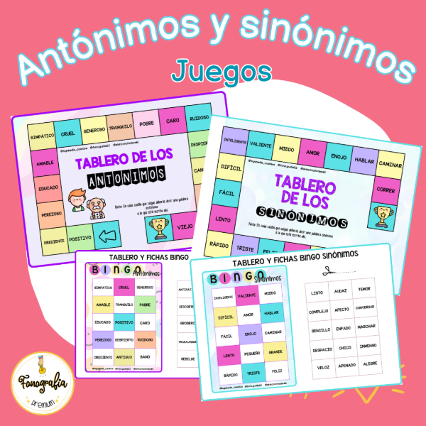 Incluye 8 tableros de recorrido y 8 cartones de bingo (4 de sinónimos y 4 de antónimos), diseñados para que los niños refuercen su vocabulario y comprensión.